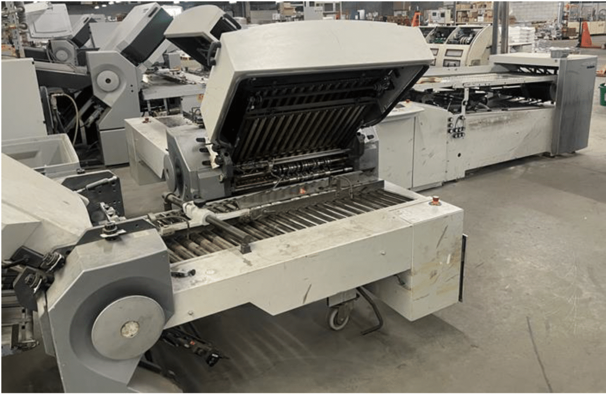 Continous Round Pile Feeder, H Series, Digital Controls, 4 Buckles with Perf/Creasing Shaft on first fold, 4 Buckles with Perf/Creasing Shaft on second fold, 4 Buckles with Perf/Creasing Shaft on Third fold, Air Compressor, Shingle Delivery, 16 Page Machine